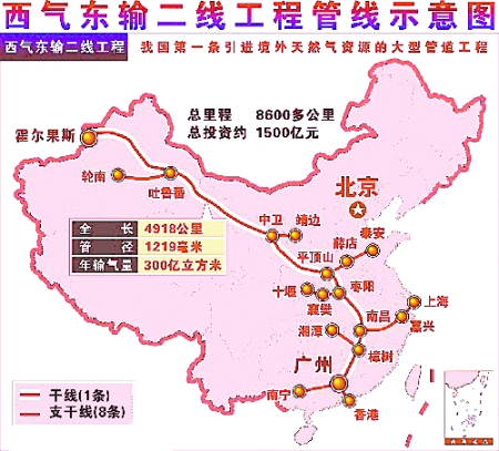 中亞天然氣管道西起土庫曼斯坦,東至中國霍爾果斯口岸,是我國第一條引進境外天然氣資源的跨國能源通道,至2010年8月完成雙線并行,年輸氣能力為300—400億立方米,占全國天然氣的20—30%。