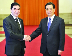 國家主席胡錦濤23日上午在人民大會堂同來華進行國事訪問的土庫曼斯坦總統別爾德穆哈梅多夫舉行會談