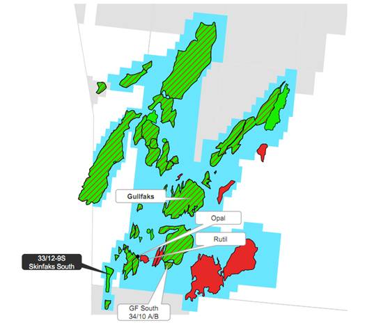 Statoil在Gullfaks繼續勘探活動,并在一年內取得了四個新發現:Rutil、Opal、Brent 10 A/B和現在的南Skinfaks。它們將增加總量5000萬-1億桶油當量。