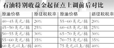 5日晚間,三家石油公司均公告了財政部上調特別收益金起征點的消息。依據通知財政部決定從2011年11月1日起,將石油特別收益金起征點從40美元提高至55美元。石油特別收益金俗稱“暴利稅”,起征點提高意味著石油公司將少向政府交稅。