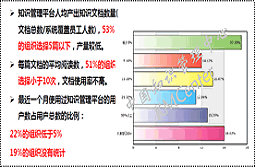 知識(shí)管理的重要性無需多言,但很多管理者認(rèn)為這是一件“不可能完成的任務(wù)”。也的確有不少“慘烈”的例子,剛開始時(shí)轟轟烈烈,逐漸偃旗息鼓,最后費(fèi)時(shí)費(fèi)力上馬的知識(shí)管理系統(tǒng),只做員工閑來翻翻之用。KM CENTER經(jīng)過調(diào)研后,在其《中國知識(shí)管理現(xiàn)狀、問題和趨勢(shì):2012中國知識(shí)管理實(shí)施調(diào)研結(jié)果分析》中給出了右圖的一組數(shù)據(jù)。