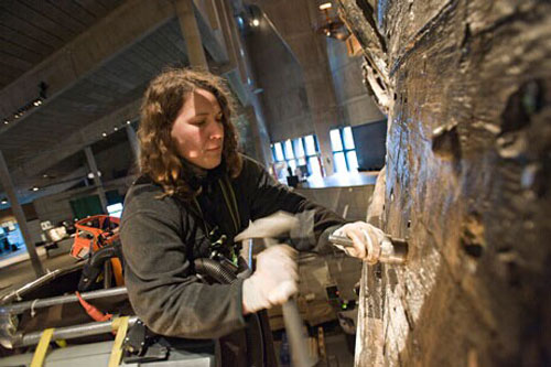 船木工ÅsaEgerquist用錘子為船身打入螺栓。