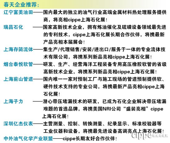 石化行業(yè)一年一度的盛會,第八屆中國(上海)國際石油化工技術裝備展覽會(cippe上海石化展)將于8月23-25日在上海新國際博覽中心召開,經過八年的發(fā)展,cippe上海石化展已經發(fā)展成為一個溝通學習、合作貿易的首選平臺,被業(yè)內企業(yè)和專業(yè)人士視為石油化工行業(yè)內最高品質的展覽會之一。遼寧富美油田、瑞昌石化、上海存簡流體、煙臺泰悅軟管、上海前山管道、上海子力、深圳億杰儀表、中外油氣化學產業(yè)聯盟等煉化上下游企業(yè)將集體亮相本屆展會,共同探討煉化企業(yè)的未來發(fā)展方向。