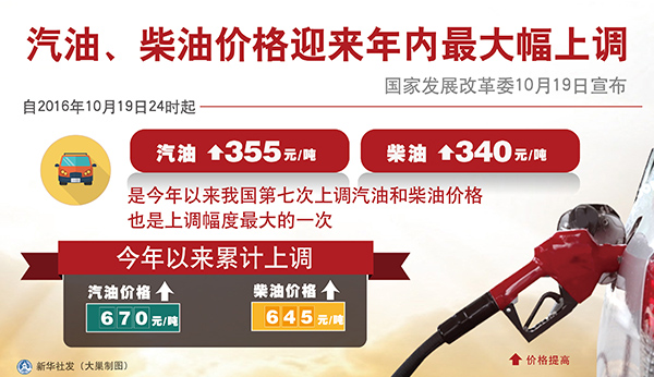 國家發展改革委19日宣布,根據近期國際市場油價變化情況,按照現行成品油價格形成機制,自2016年10月19日24時起,國內汽油、柴油價格每噸分別提高355元和340元。