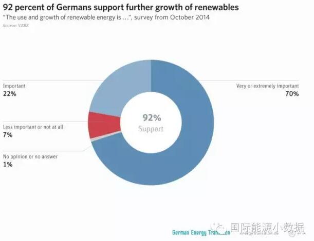 德國能源轉(zhuǎn)型,發(fā)電總量中可再生能源比例已經(jīng)超過30%,而居民電價也在歐洲國家中相對比較高。然而,民意調(diào)查顯示,德國民眾中92%支持能源轉(zhuǎn)型(70%認為能源轉(zhuǎn)型非常重要、22%認為能源轉(zhuǎn)型比較重要),只有8%的民眾對能源轉(zhuǎn)型持負面態(tài)度。