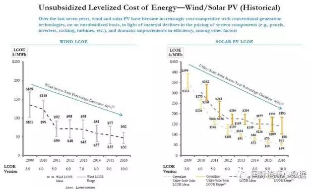 美國咨詢公司Lazard每年評估美國各類能源發(fā)電的全生命周期平準(zhǔn)成本(LCOE),2016年12月15日公布了第10份報告。這份報告中的一幅圖表顯示了2009年以來美國風(fēng)電、光伏成本的下降趨勢。