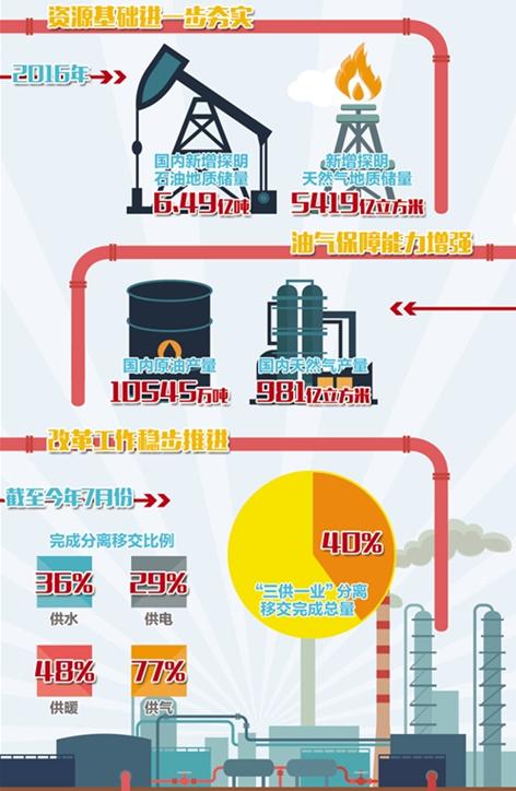 黨的十八大以來(lái),中國(guó)石油天然氣集團(tuán)公司貢獻(xiàn)了全國(guó)油氣當(dāng)量產(chǎn)量的60%,天然氣供應(yīng)量約占全國(guó)70%,完成油品質(zhì)量升級(jí)“三連跳”,在《財(cái)富》世界500強(qiáng)的位次由第十提升至第四;企業(yè)總部機(jī)關(guān)職能優(yōu)化和機(jī)構(gòu)改革順利完成,天然氣與管道體制改革邁出實(shí)質(zhì)性步伐,業(yè)務(wù)重組持續(xù)推進(jìn),混改取得重要突破……