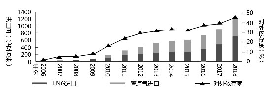 中國天然氣進口量及對外依存度變化(來源:2018年國內(nèi)外油氣行業(yè)發(fā)展報告)