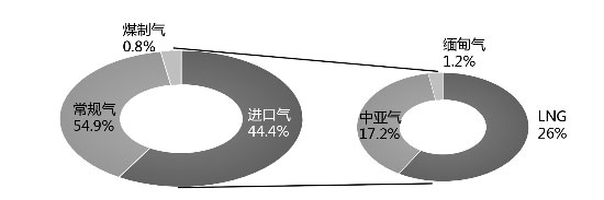 2018年中國天然氣供應(yīng)結(jié)構(gòu)(來源:2018年國內(nèi)外油氣行業(yè)發(fā)展報告)