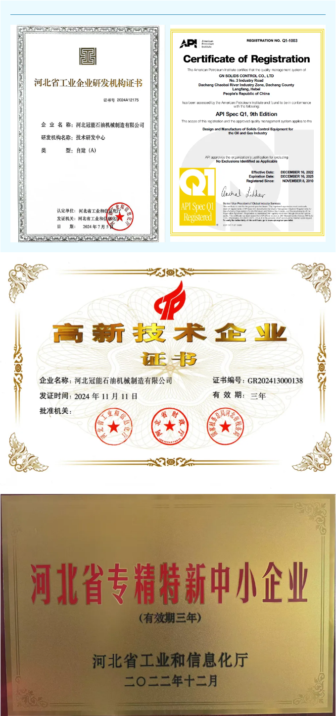 公司專注于鉆井泥漿固控設(shè)備和鉆井廢漿處理設(shè)備的創(chuàng)新與研發(fā),致力于為客戶提供優(yōu)良的產(chǎn)品,公司在國際市場的產(chǎn)品銷售取得了優(yōu)異的成績,市場份額較國內(nèi)同行有較大的優(yōu)勢,并形成了良好的口碑。冠能固控是國內(nèi)較早成功研制出鉆屑甩干機(jī),并成功出口國際市場的中國制造商。冠能固控目前已通過歐盟CE認(rèn)證、環(huán)境安全 HSE 認(rèn)證、俄羅斯 TRCU 認(rèn)證,也是國內(nèi)連續(xù)通過美國石油協(xié)會 API認(rèn)證次數(shù)較多的固控設(shè)備制造商。