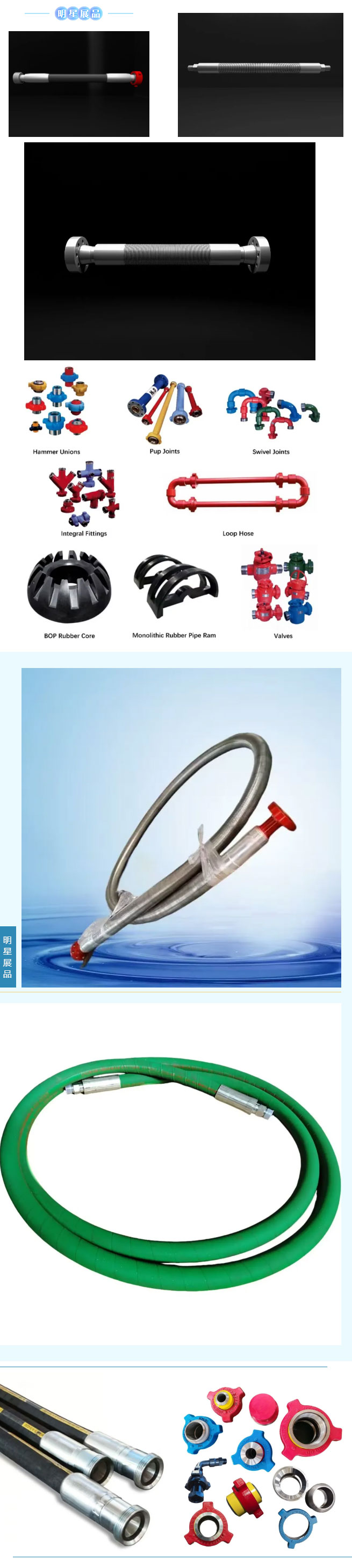 公司主要生產、銷售:井控專用BOP高壓耐火隔熱軟管總成、水龍帶、柔性節流壓井管線、快速接頭、高、中、低壓由壬、BOP膠芯等石油配件,其中一項國家發明專利,二十多項國家實用新型專利、兩項國家級新產品,產品在國內外各陸海油田得到了全部推廣和使用,在國外承包工程中得到了英國BP公司、殼牌公司、日本北海道公司的外商和專家的認可,并出口俄羅斯、泰國、澳大利亞、法國、俄羅斯、土庫曼等十幾個國家和地區,深得到中外用戶的一致好評。
